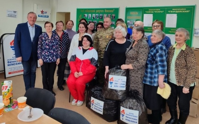 Конечно же, отпустить участника СВО с пустыми руками в Клубе избирателей не могли: ему передали маскировочные сети и посылки для бойцов его подразделения.